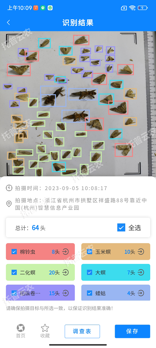 3. 識別蟲類:當前蟲庫包括以下種類的成蟲——草地貪夜蛾、草地螟、稻縱卷葉螟、二化螟、玉米螟、斜紋夜蛾、甜菜夜蛾、小地老虎、八字地老虎、大地老虎、棉鈴蟲、二點委夜蛾、大螟、可在蟲庫中任意選擇5種。